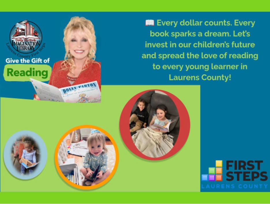 All funds raised will be used to expand the Dolly Parton’s Imagination Library. This expansion will extend the library to every child in Laurens County through Laurens County First Steps. We can achieve widespread access to this life-changing early literacy initiative by uniting Laurens School District 55’s program with LCFS. This effort ensures all families across the county benefit.